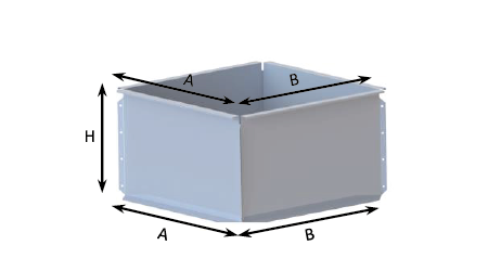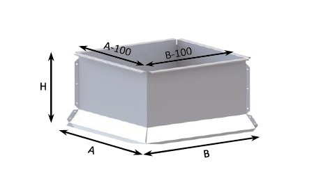 composed of four segments made of galvanized steel sheet with a thickness of min. 1.25 mm. Base height adapted to the roof structure and technical requirements, from 300 to 1000 mm. Standard heights: 350, 500, 750 mm. Smoke damper bases require a support structure around the perimeter.