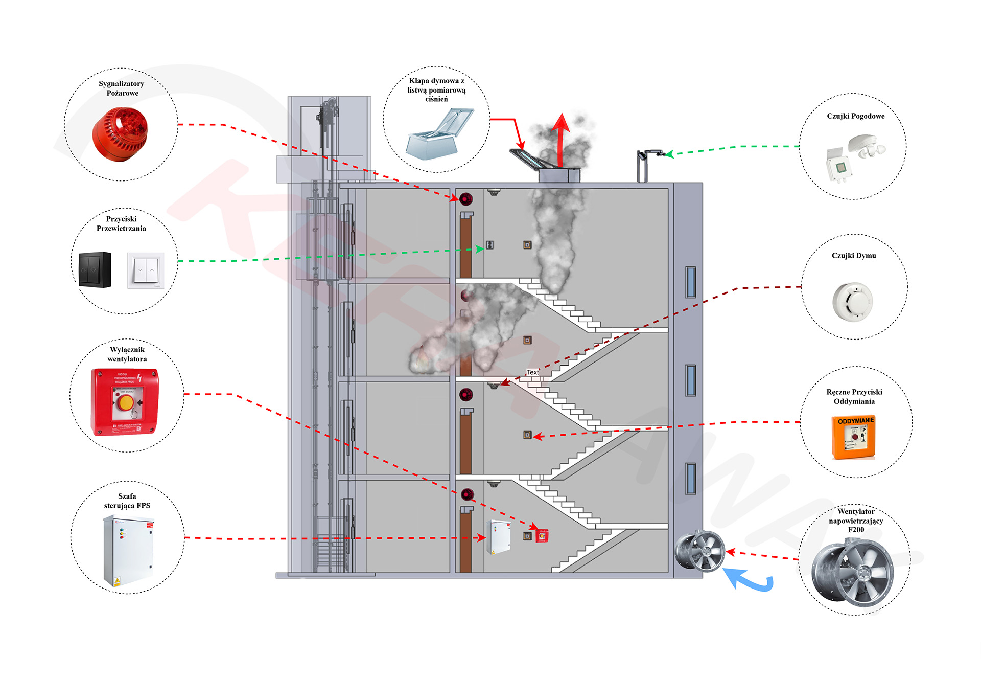 W momencie wykrycia pożaru otwiera się klapa i uruchamiany jest wentylator nawiewny. Stosujemy przetwornik różnicy ciśnień lub listwę pomiarową aby płynnie regulować obrotami wentylatora (np. przy otwarciu drzwi). W ten sposób unikamy spadku przepływu powietrza na klapie dymowej. Należy pamiętać, że zbyt mała prędkość wypływu wydłuża czas usuwania dymu, natomiast za duża prędkość powoduje turbulencje pod stropem i wpływa niekorzystnie na skuteczność działania systemu